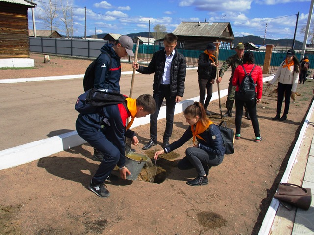 Перед торжественно выстроившимися школьниками выступил главный лесничий Хоринского лесничества Каратаев А.Ю. Он призвал ребят оставить о себе добрую память, украсив родную школу зелёными насаждениями, за которыми необходимо ухаживать и оберегать их. Участковый лесничий Григорьева С.И. вкратце рассказала о высаживаемой породе вяз мелколистный и объяснила технологию посадки, после чего все дружно взялись за дело.