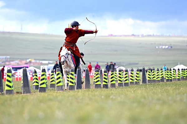 — Монголы стреляют из лука на высокой скорости, верхом на лошадях. Зрители восхищаются тем, как они мчатся, развевая подолы национальной одежды, и поражаются точности их выстрелов — даже когда лошадь несётся галопом, словно птица в полёте. Сегодня конных лучников называют «меткими стрелками, попадающими в глаза бегущей газели». Монголы внесли в конную стрельбу из лука элемент скорости, превратив её в настоящий экстремальный спорт и совершив революционный скачок в её развитии.