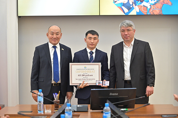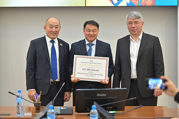 Алдар Намсараев за золотую медаль на чемпионате Европы по самбо в весовой категории 58 килограммов, и заслуженный тренер Республики Бурятия Жаргал Баирович Жигжитов за успешную подготовку спортсмена;